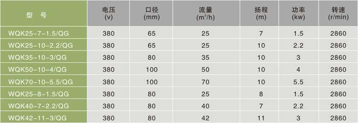 產(chǎn)品概述WQK/QG系列帶切割裝置潛水泵,具有排污通過能力特別強,帶切割性能好,能將污水中的長纖維、塑料、紙帶、布條、稻草、繩子等雜質(zhì)切碎后排出,采用最先進(jìn)的方法,設(shè)計成最合理的水力特性,使電泵可以全揚程運行,優(yōu)良的干式電機和水泵的最佳組合,使電泵的總效率達(dá)到西德ABS公司的AS帶切割裝置系列產(chǎn)品相同。電泵采用高質(zhì)量的硬質(zhì)合金,雙端面機械密封和骨架油封組合的動密結(jié)構(gòu)。為了電泵的正常運行及工作人員的安全,用戶應(yīng)配備電動機的漏電保護器。在長時間內(nèi)工作,本泵電機不允許露出液面部位,抽送污物溫度不超過40℃。
